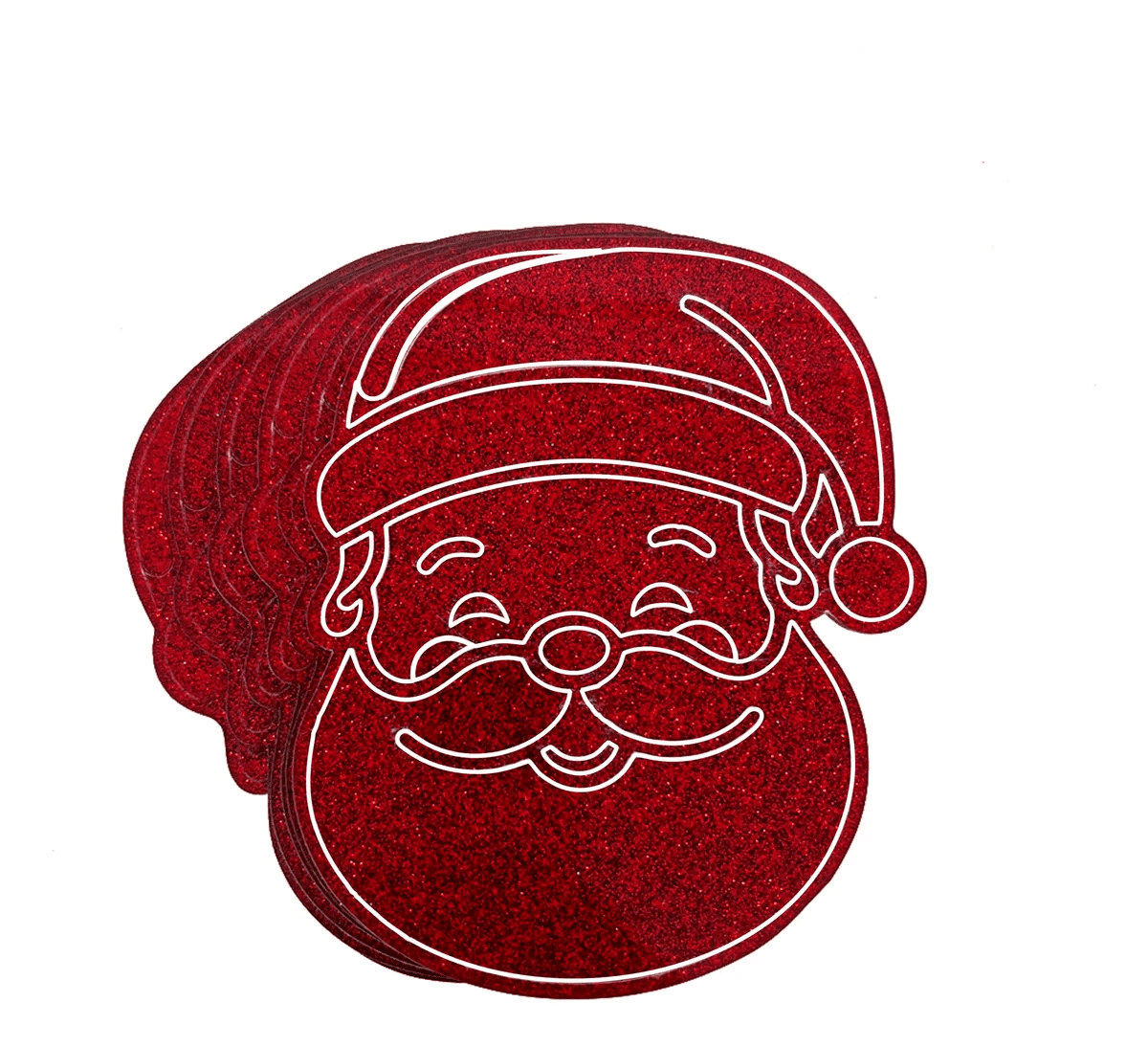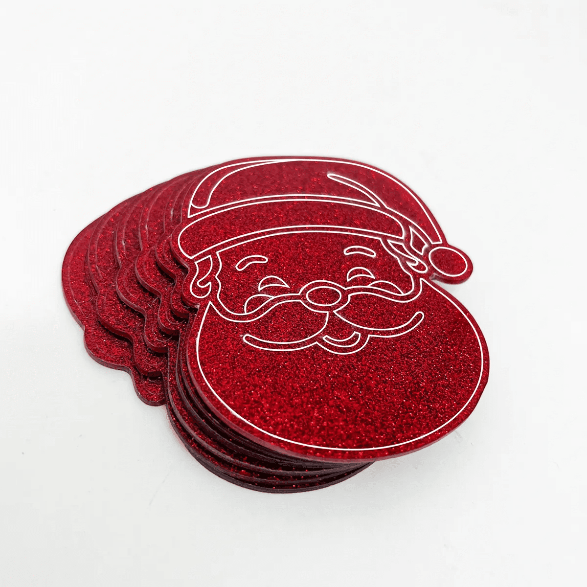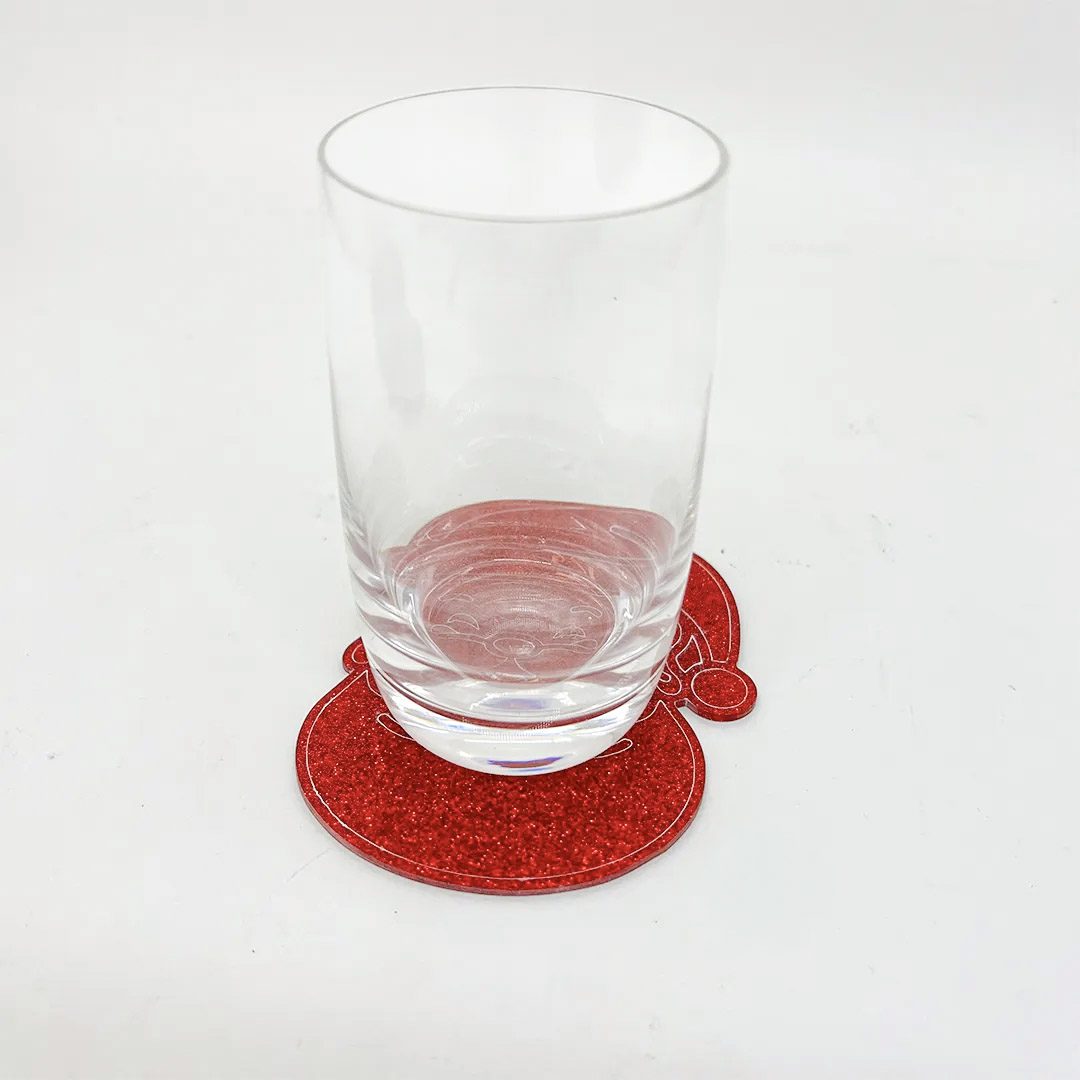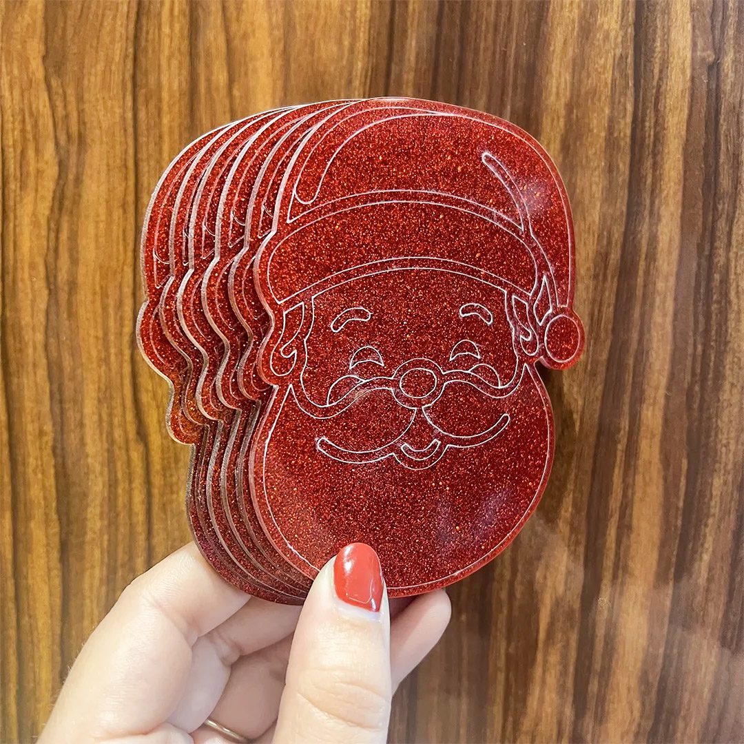 6 porta copos em formato de papai noel, feito em acrílico vermelho glitter 2mm.